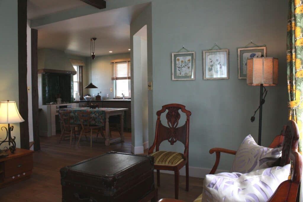 ◎一階グレートルームはオリジナル漆喰のグリーンが印象的です。